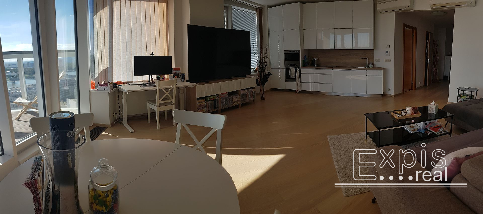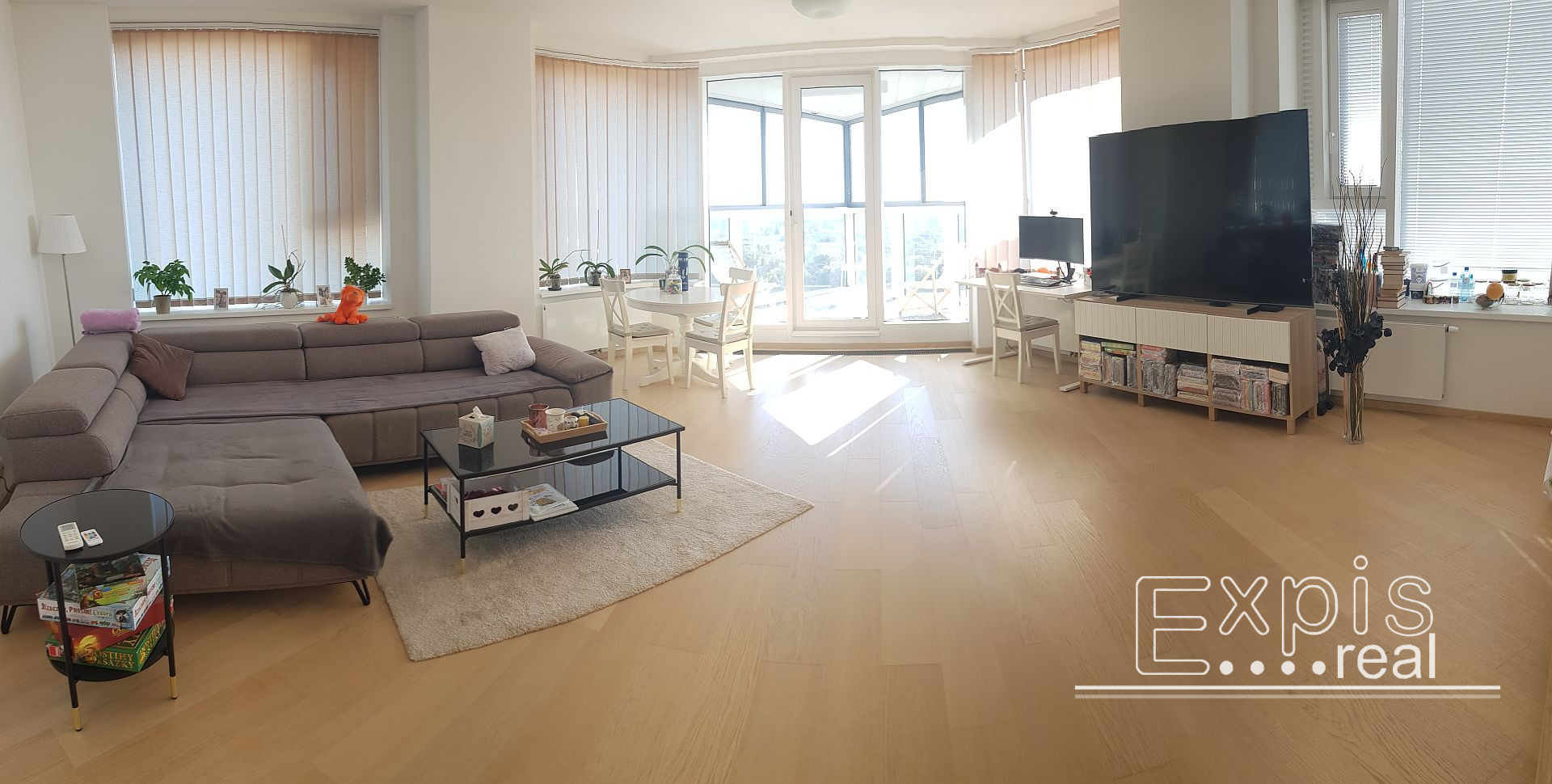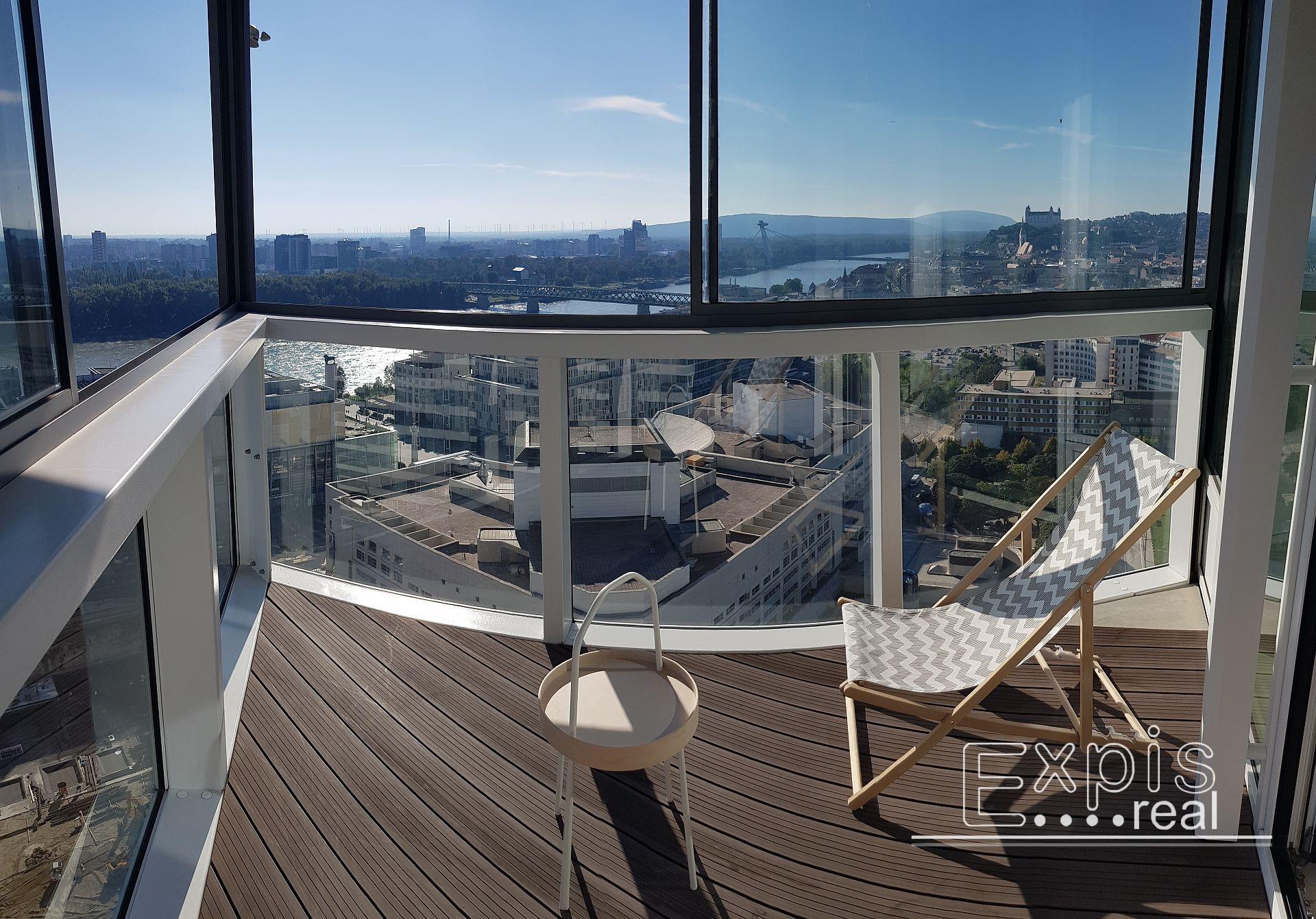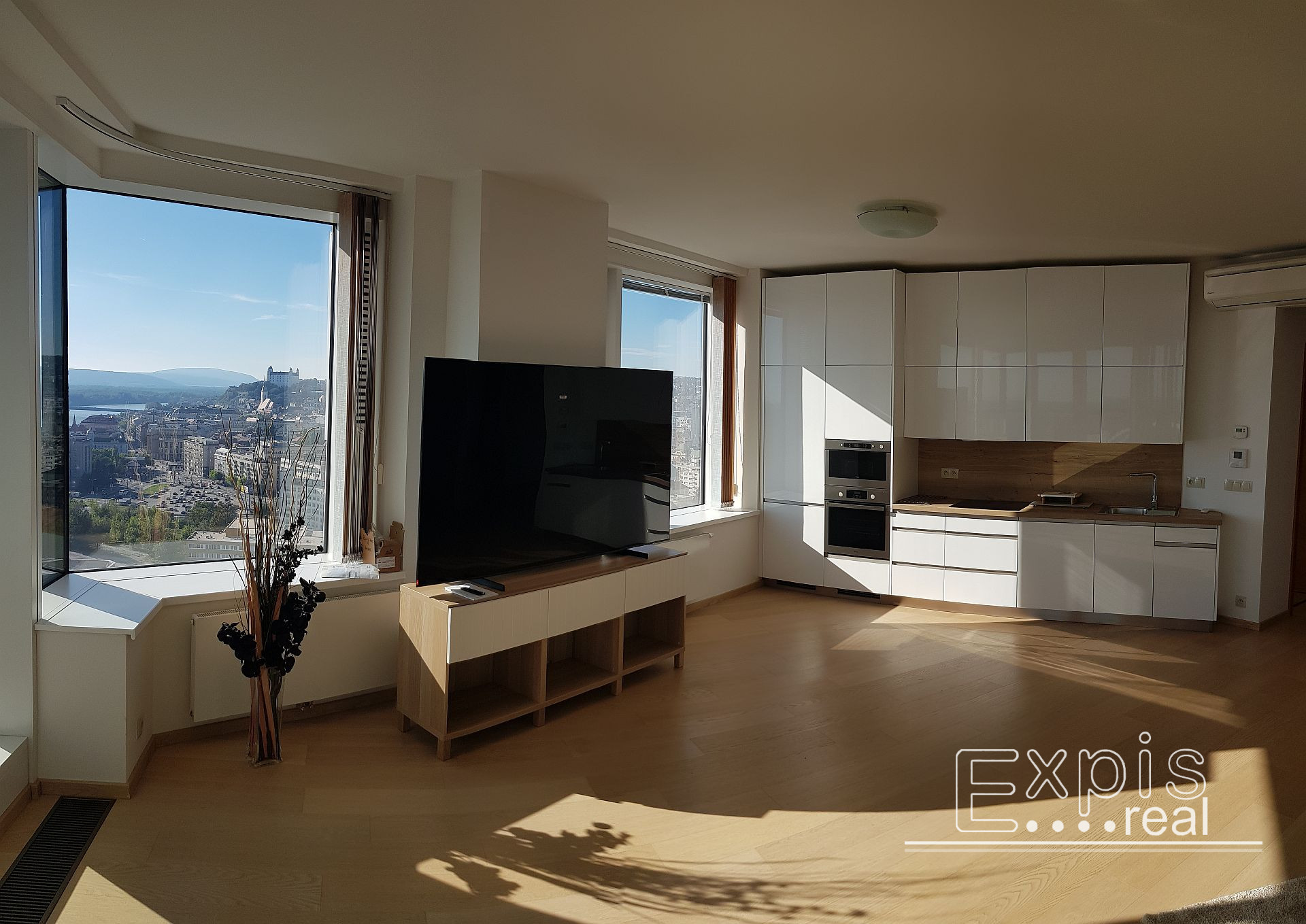 Exkluzívny 3 - izbový byt s loggiou na TOP adrese v centre Bratislavy v PANORAMA CITY - najvyššie obytné veže na Slovensku v lokalite Bratislava I, Staré Mesto, na nábreží Dunaja, pri Eurova a Slovenskom národnom divadle. 24 podlažie. Byt má nádherný výhľad na Staré mesto, SND, Dunaj a Hrad, s výmerou 98 m2 (91 m2 byt + loggia 7 m2).