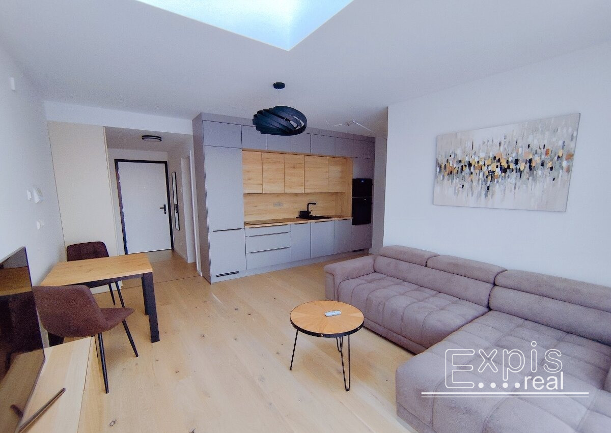 Interiér bytu je ladený v čistých, svetlých tónoch a je kompletne zariadený – stačí si priniesť osobné veci a nasťahovať sa. V obývacej časti sa nachádza pohodlná sedacia súprava a moderná kuchynská linka so zabudovanými spotrebičmi. Spálňa ponúka dostatok úložného priestoru a priamy vstup na balkón.