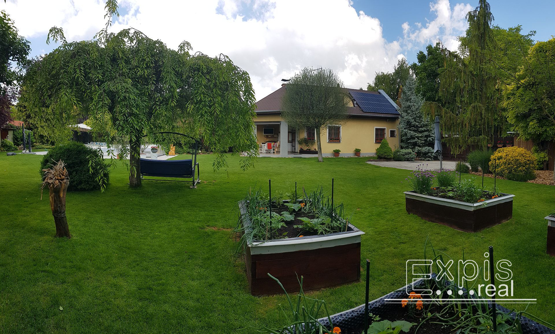 Záhrada: o výmere 997 m2, celá oplotená, s udržiavanou záhradnou zeleňou, položený trávnik so siežkami proti krtkom, robotická automatická kosačka zn. Husqvarna, automatický závlahový systém, 4 x zvýšené záhony na zeleninu, 3 x jabloň, slivka, 2 x trojmiestne hojdačky, 5 x slnečníky.