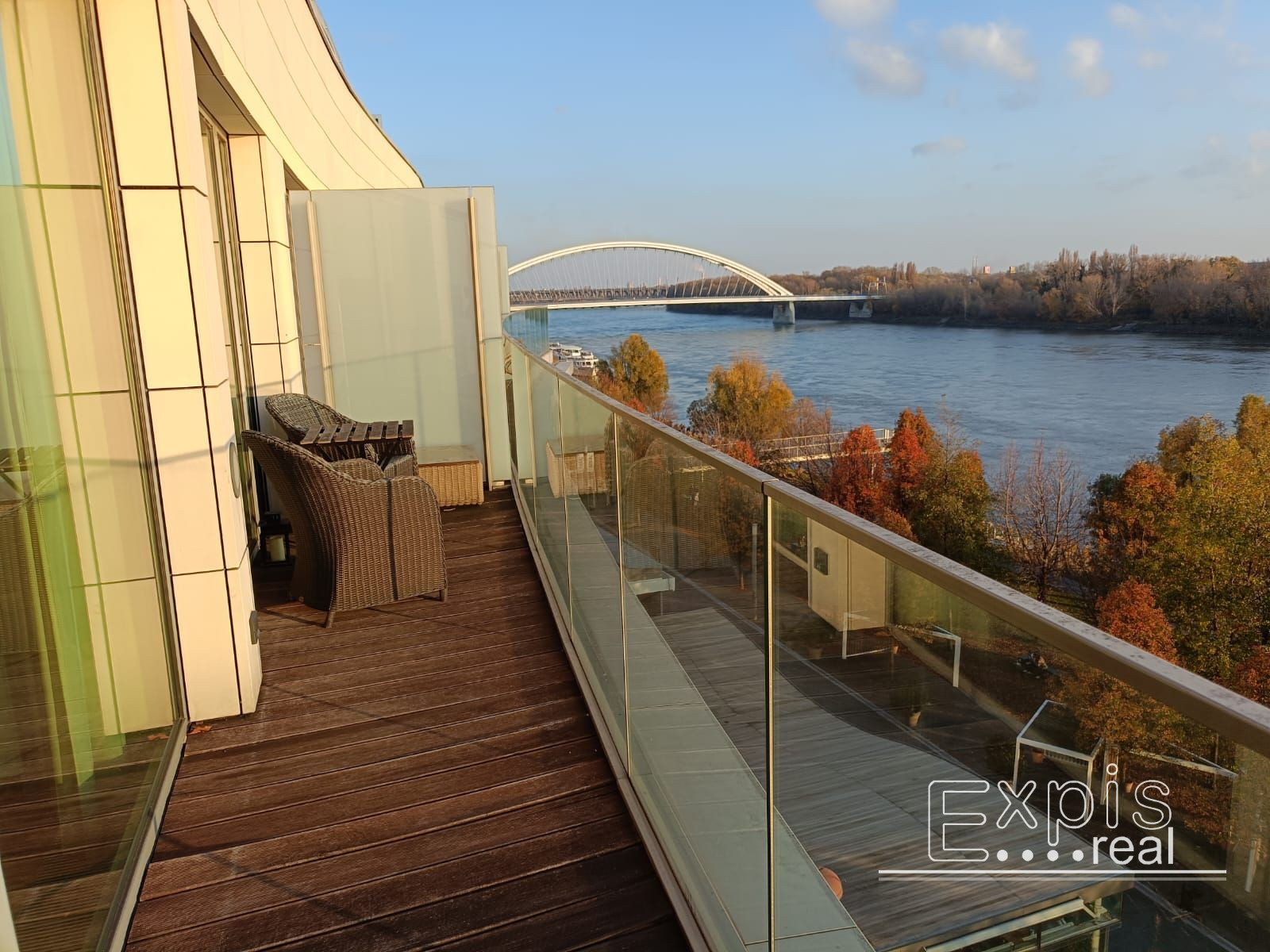 Byt je kompletne zariadený pripravený na okamžité bývanie. Výhľad na Dunaj, 4. Poschodie. 24 hodinová ochranná služba, kamerový systém. 60,05m2 + 10,44m2 terasa.